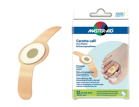 FOOT care Náplasti na kuří oka jsou speciální náplasti k odstranění kuřích ok, mozolů a zrohovatělé kůže, vybavené ochranným terčíkem z polyuretanové pěny, uvnitř obsahující voskovou matrici s TCA (kyselina trichloroctová) pro keratolytický proces, který změkčuje vrchní vrstvu pokožky. Doporučuje se pro bezpečné a bezbolestné odstranění kuřích ok, zrohovatělé kůže nejen pro dospělé, ale i pro děti již od 3 let. Náplasti jsou sensitive (obsahují hypoalergenní lepidlo) vhodné pro velmi citlivou pokožku a jsou v tělové barvě. Náplast dobře drží. Balení obsahuje 12 náplastí. Dvojí účinek