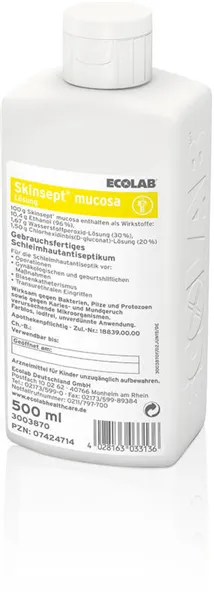Skinsept Mucosa je biocidní přípravek. Není proto určena k léčebnému účelu. V souladu s návodem je určena k dezinfekci pokožky v okolí sliznic pohlavních  orgánů, ale ne na sliznice a to ani na vnější sliznice pohlavních orgánů.